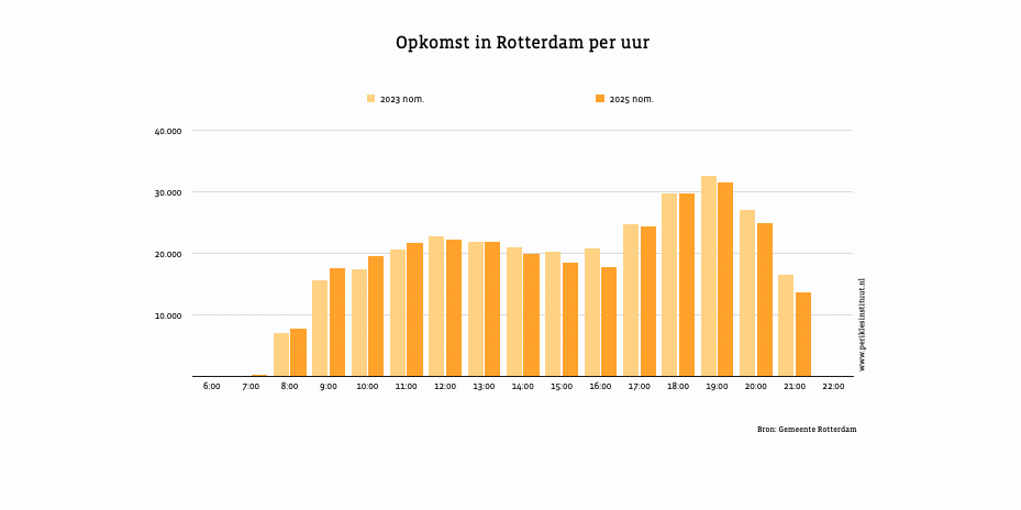 In de vroege uren lag de opkomst in Rotterdam duidelijk hoger dan twee jaar geleden, maar dat verschil verdween in de middag. ‘Ik was vanochtend wat enthousiast,’ vertelde Bijl. ‘Tot een uur of elf lag de opkomst echt hoger dan in 2023. Alleen op de een of andere manier is dat helemaal ingekakt rond de lunch. Zo rond vier uur waren er zelfs drieduizend mensen minder gaan stemmen dan twee jaar geleden.’